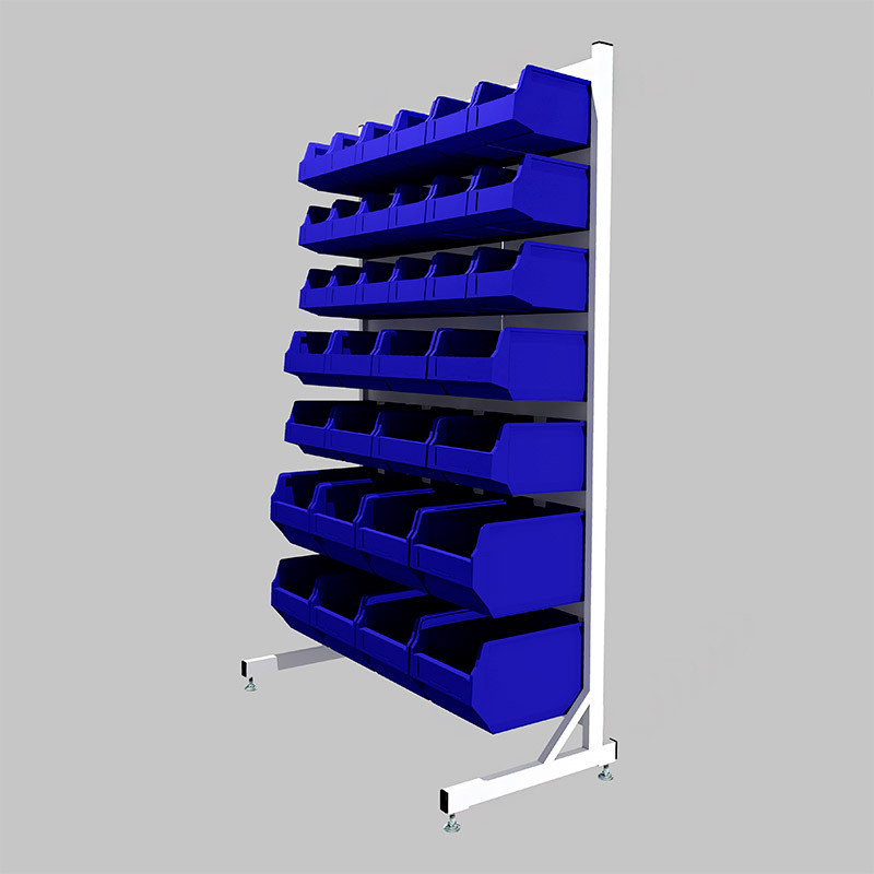 Сварная усиленная конструкция стоек стеллажа из профильных стальных труб дает максимальную прочность, надежность и долговечность. Регулируемые металлические опоры позволяют устанавливать стеллаж на неровной поверхности. Такая система хранения обеспечивает легкий доступ к содержимому ячеек (лотков). У каждого лотка есть карман для бирки с наименованием содержимого. Конструкция позволяют легко навешивать и снимать лотки.